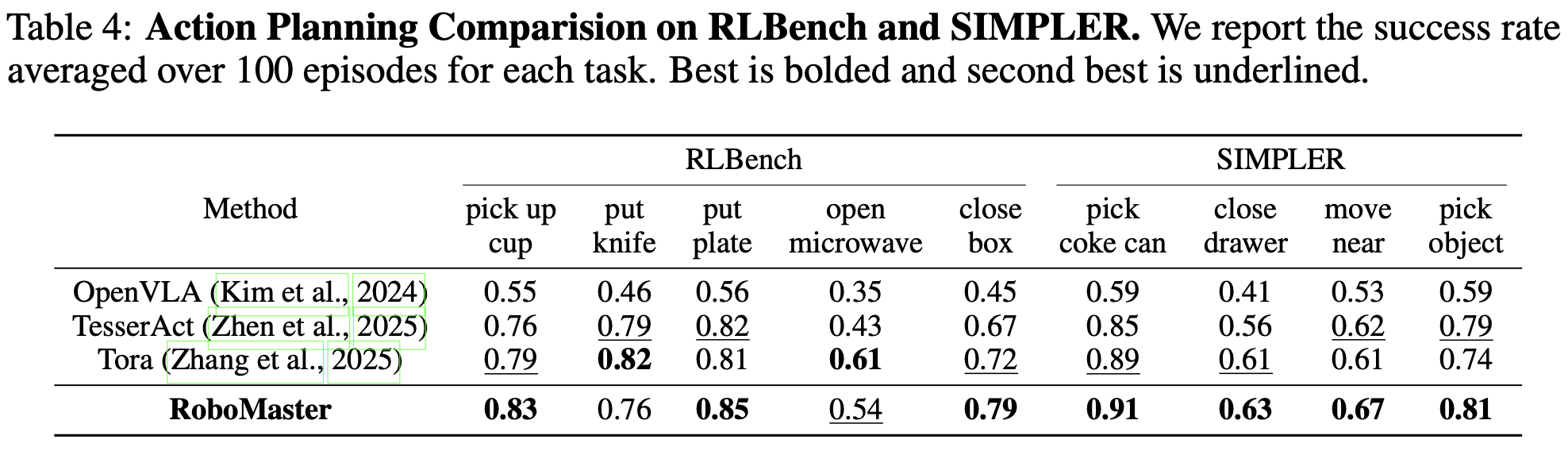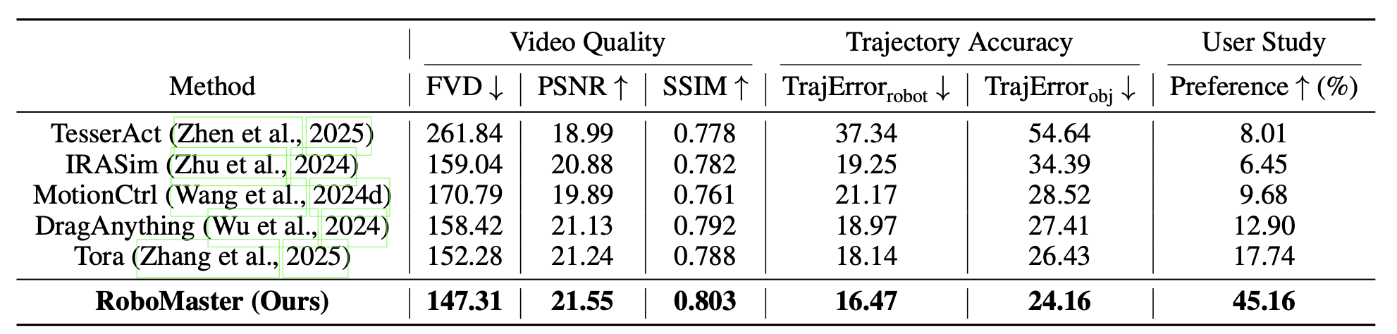 RoboMaster synthesizes realistic robotic manipulation video given an initial frame, a prompt, a user-defined object mask, and a collaborative trajectory describing the motion of both robotic arm and manipulated object in decomposed interaction phases. It supports diverse manipulation skills and can generalize to in-the-wild scenarios.